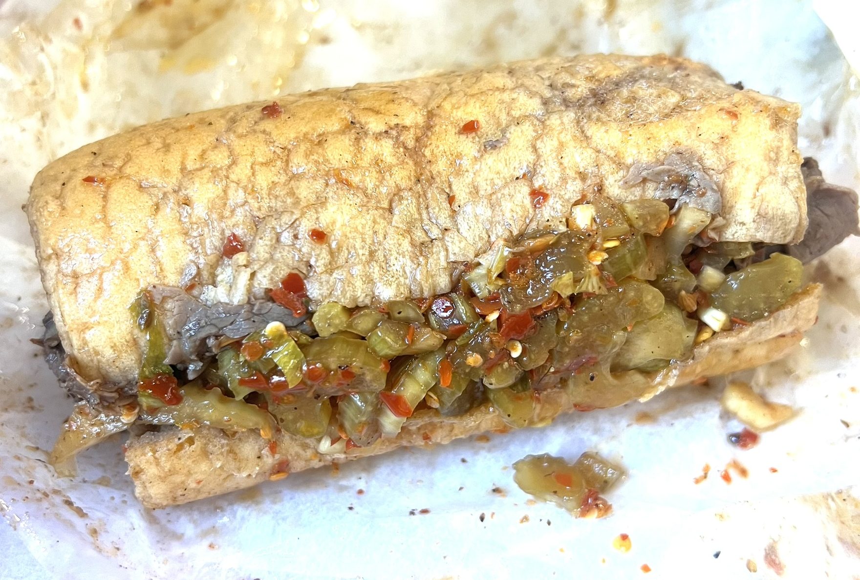 Shaved Beef that has been braised on a French Loaf. Add in spicy Giardiniera Peppers and then dipped in the jus.