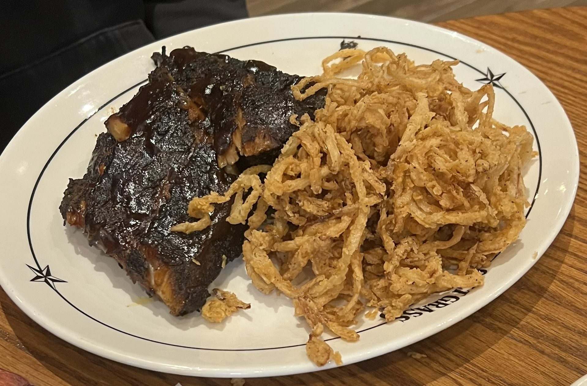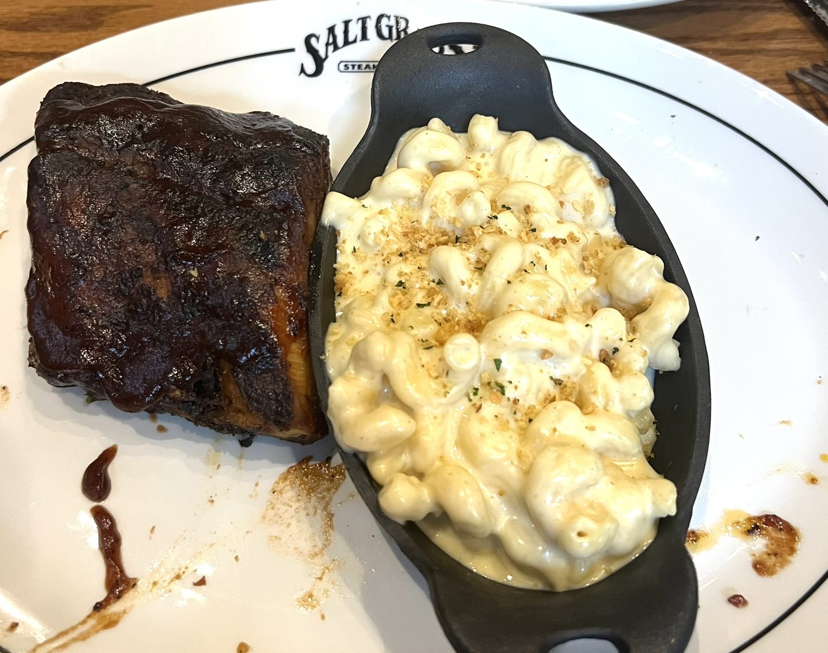 Ribs with Mac and Cheese and also with Fried Onions.