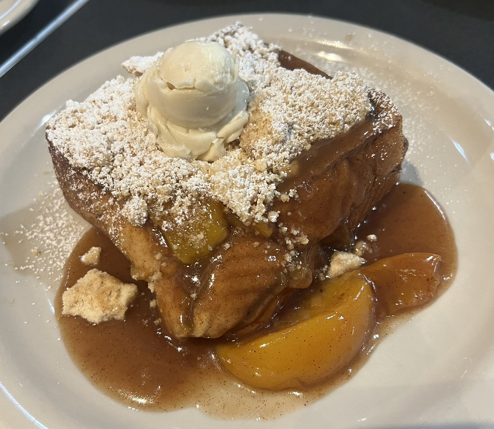 Peach Cobbler French Toast. My goodness. Peaches in the middle, a crumble on top. So sweet, so delicious, so attas!