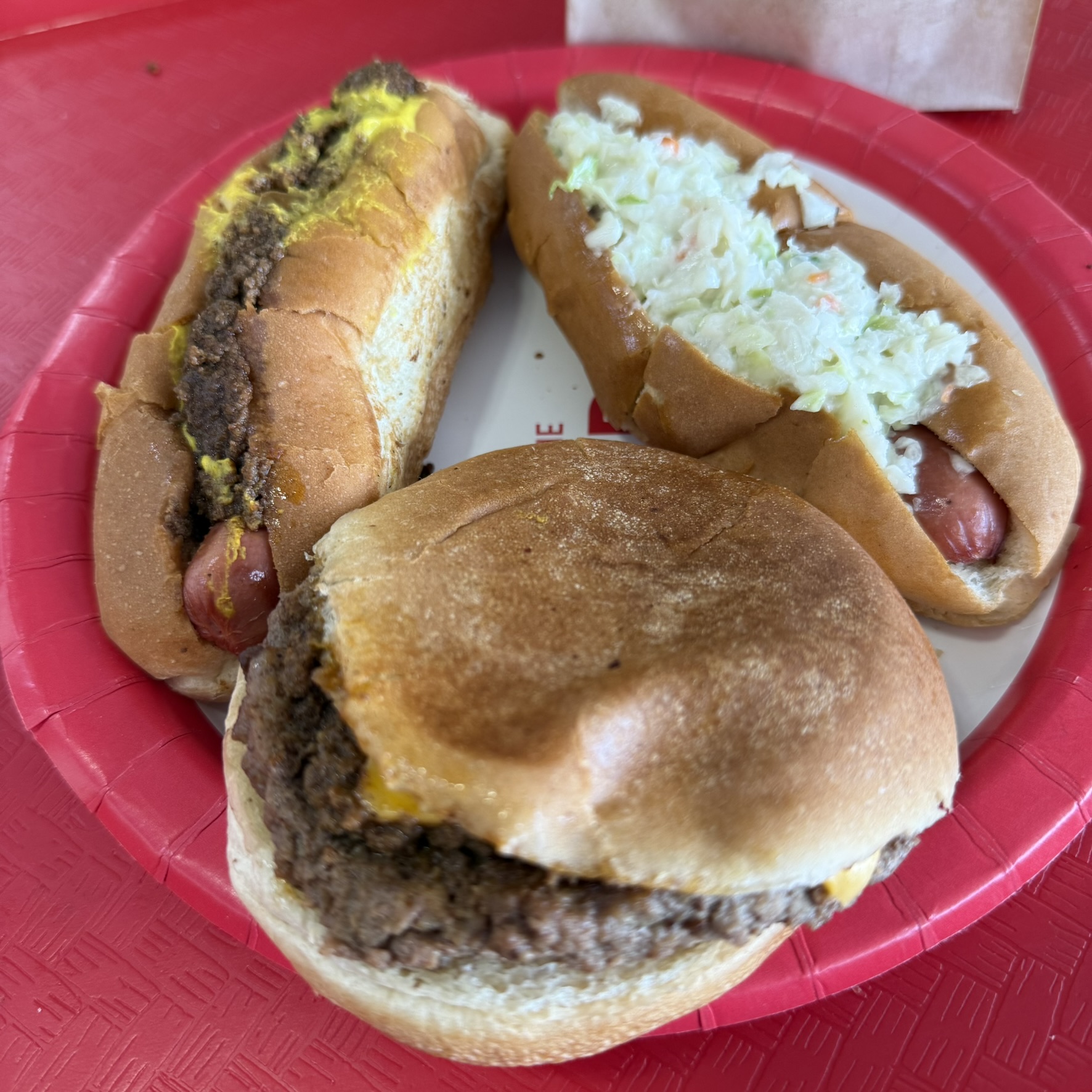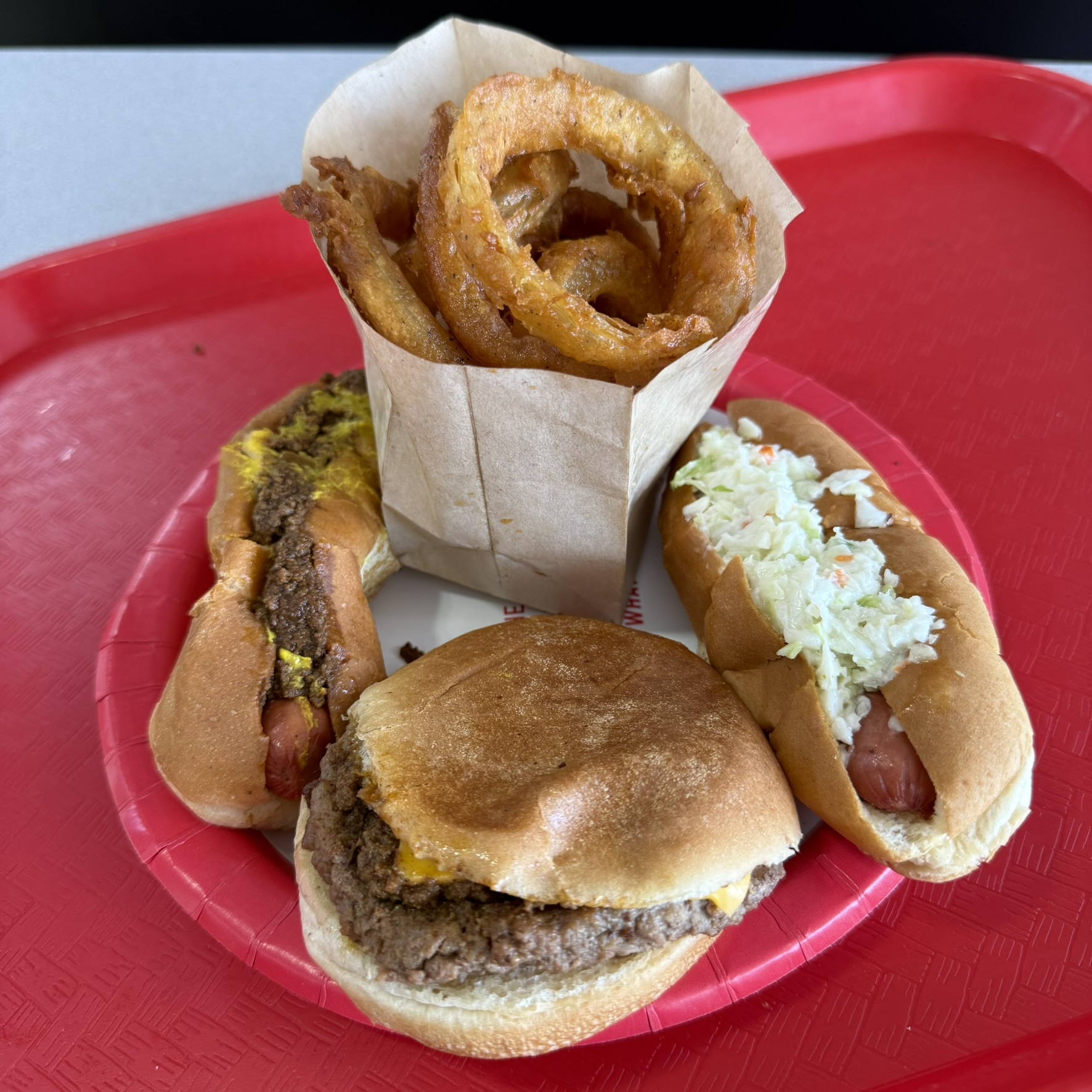 Chili Cheese Dog, Chili Cheese Burger and a Slaw Dog with Onion Rings.