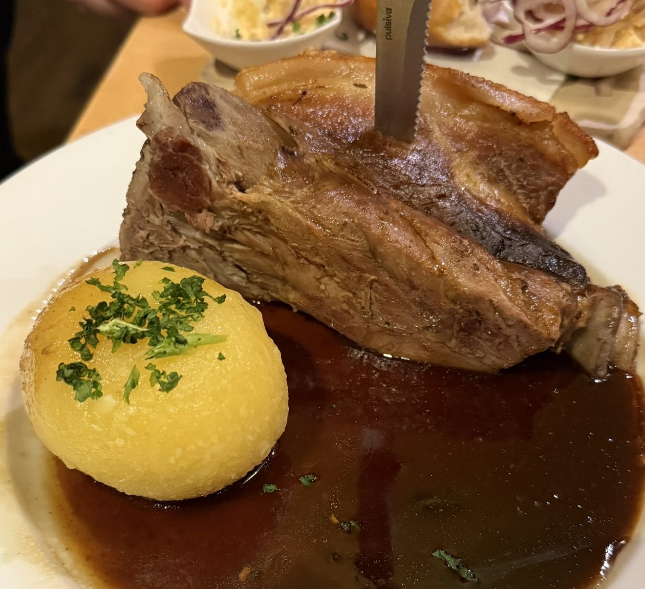I went for one of my favorites, the Roasted Pork Shoulder – Schäfele. So tender and the Crackling so crisp and crunchy. So good. But I don’t eat the potato dumplings.