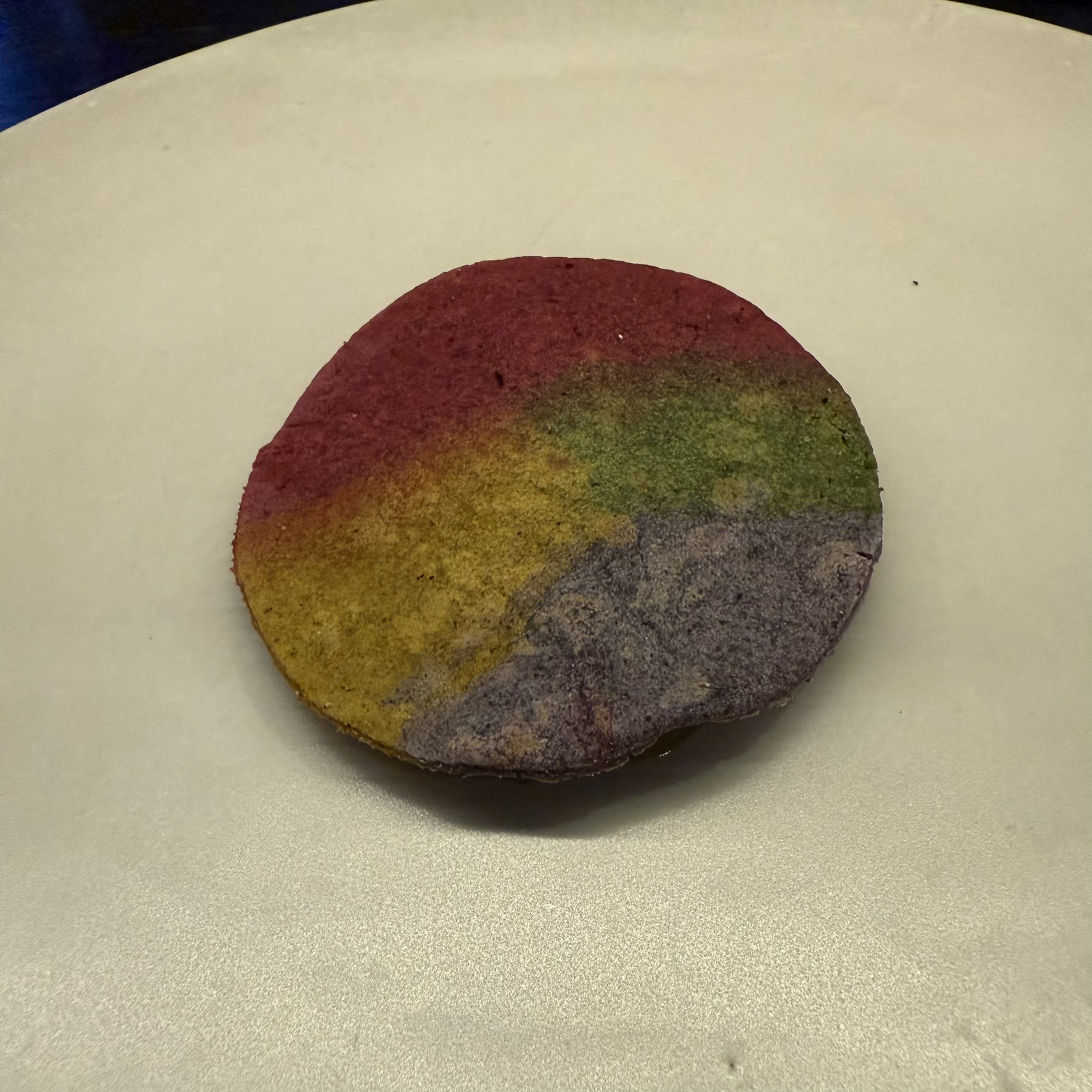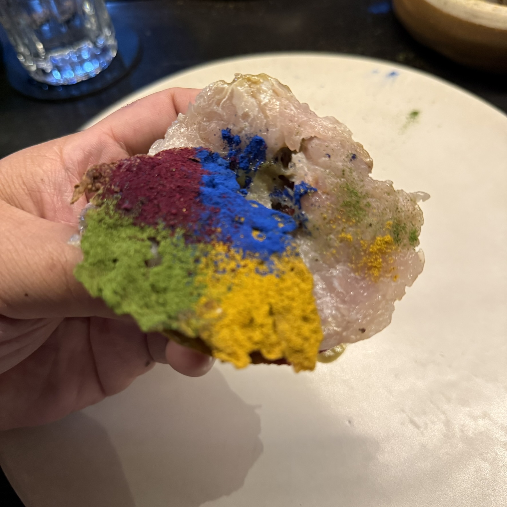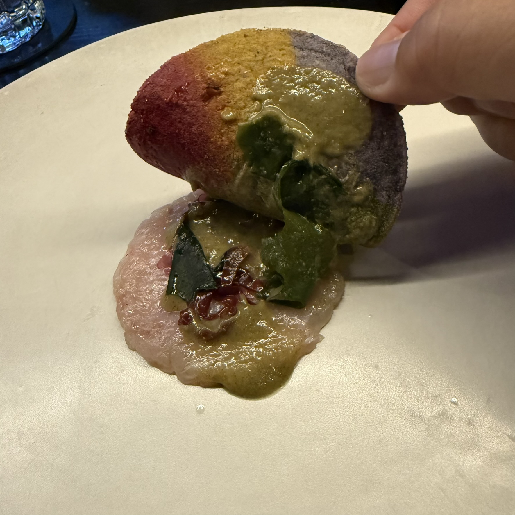 A Kanpachi Mince underneath a colored Tortilla, with a colored cracker. Unassuming but flavorful.