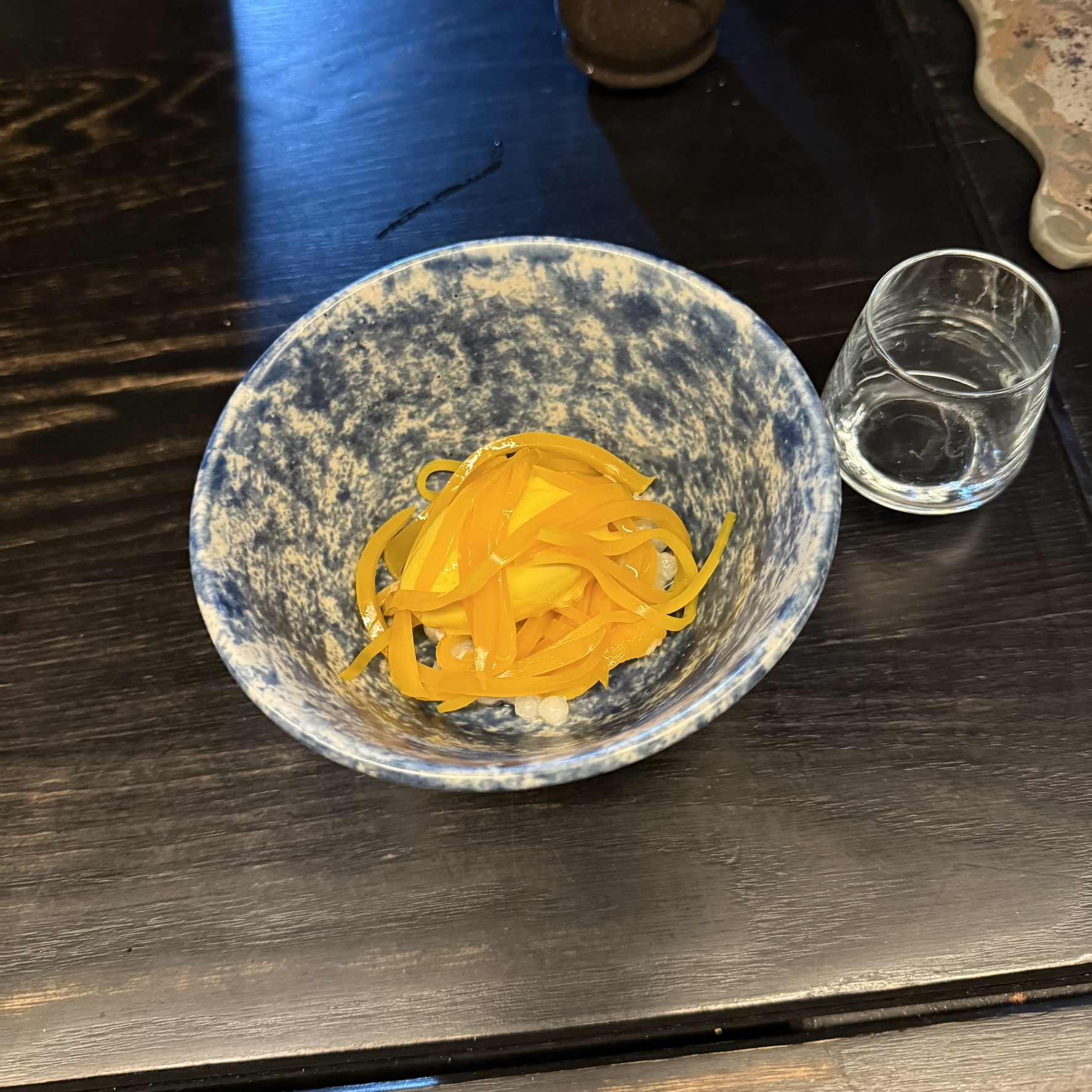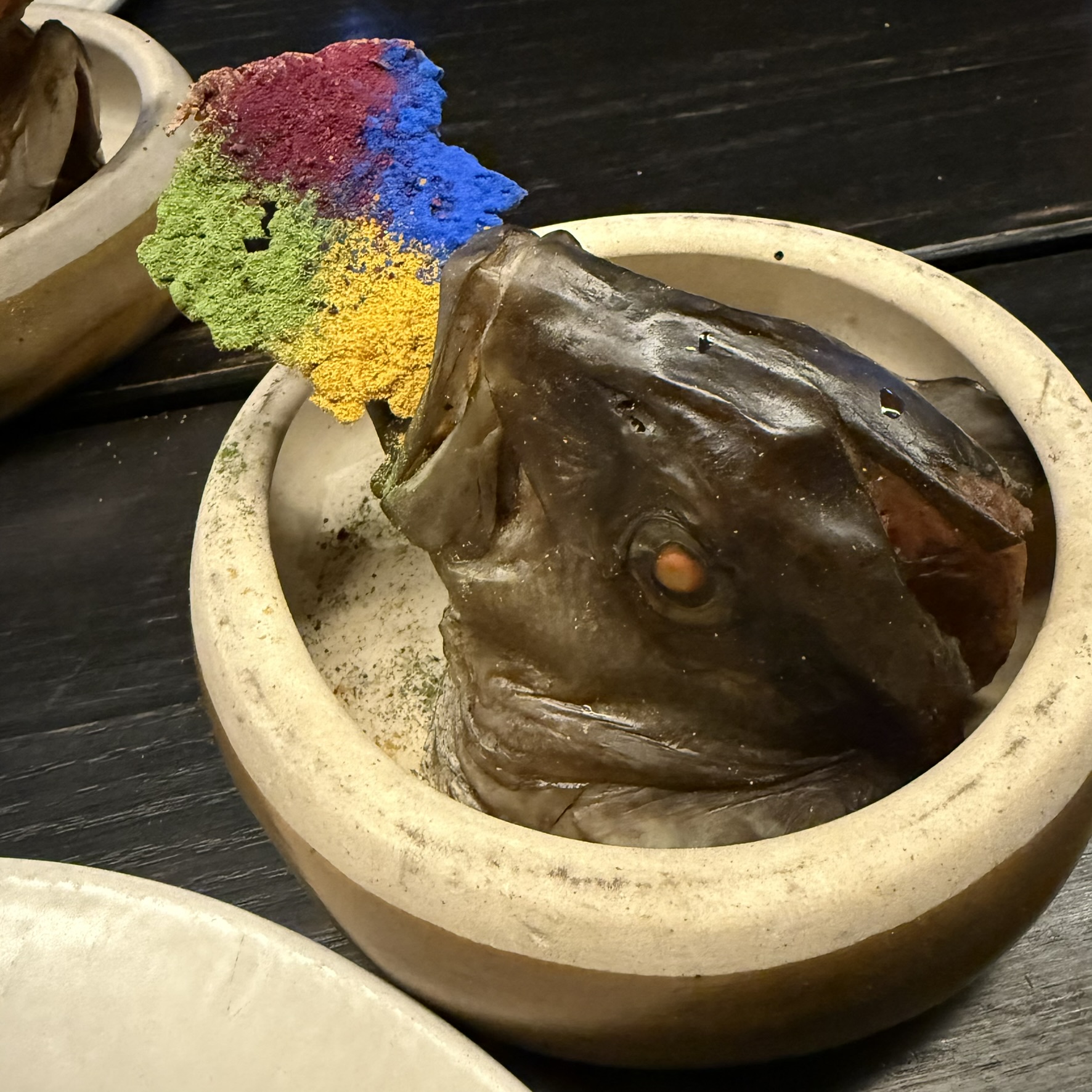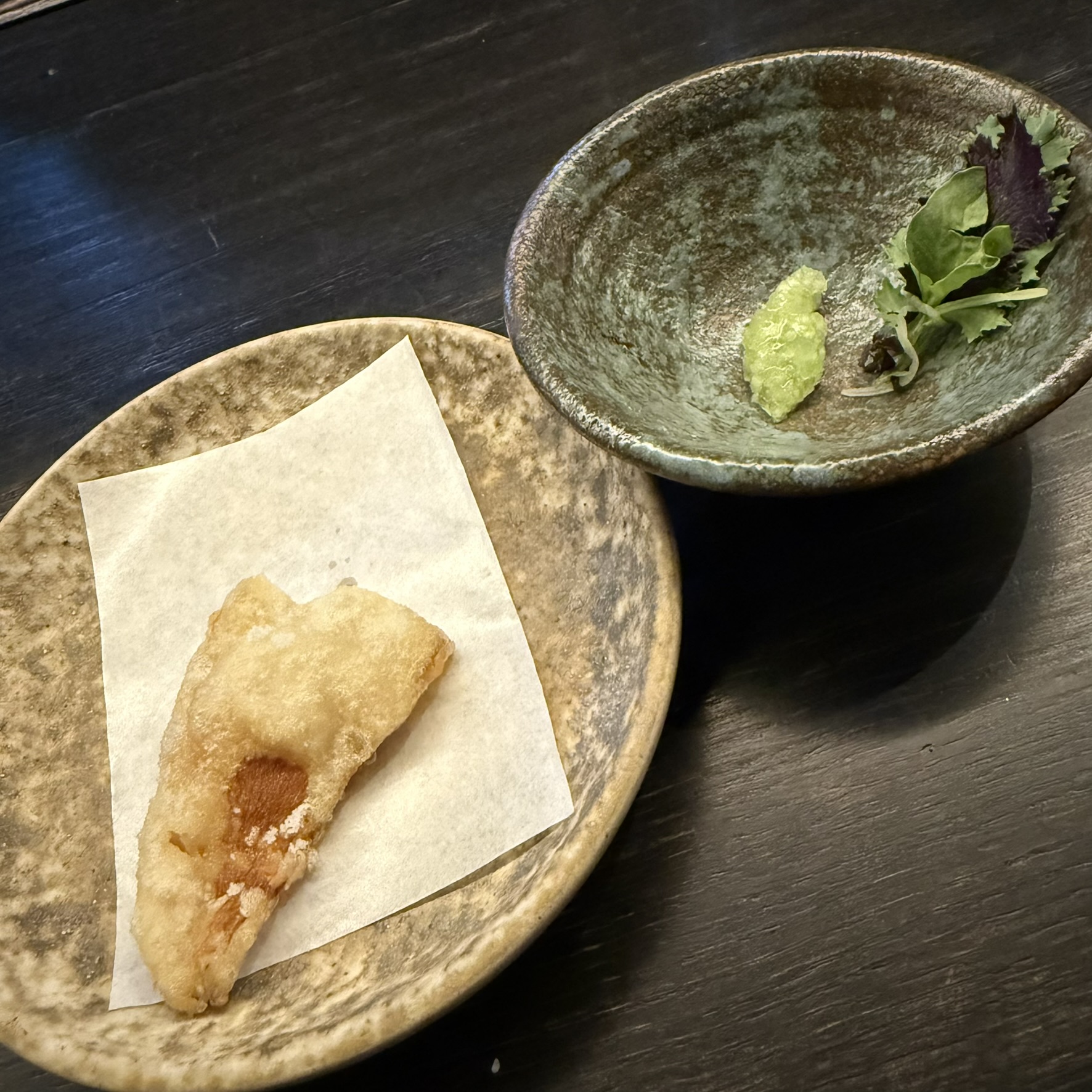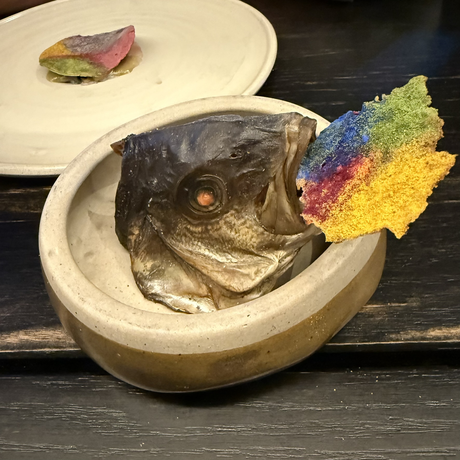 A Kanpachi Mince underneath a colored Tortilla, with a colored cracker. Unassuming but flavorful.