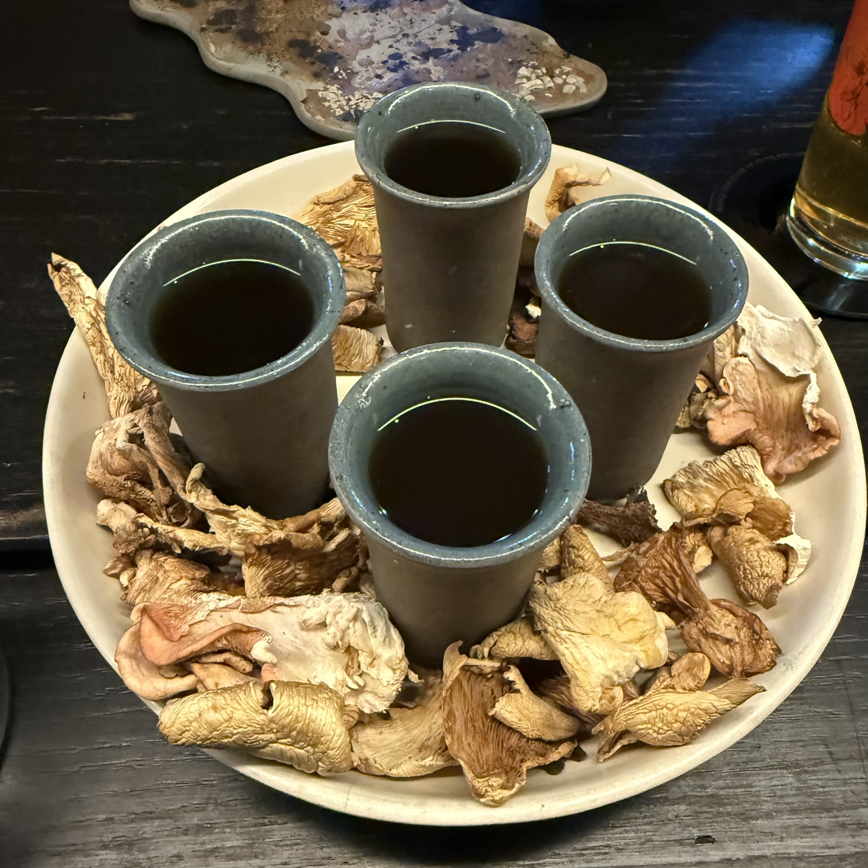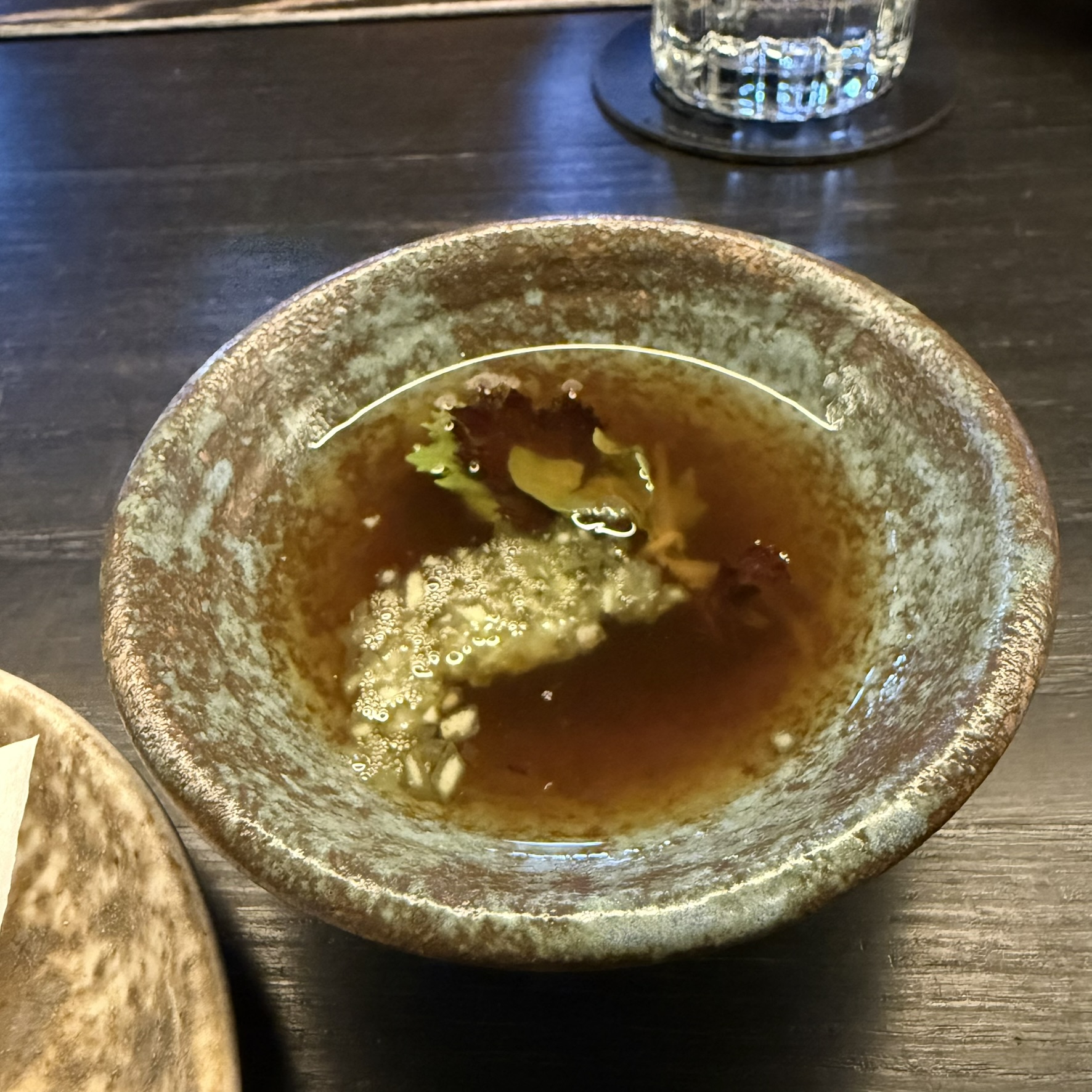 A Fried Mushroom with a Mushroom Broth mixed with some greens. Interesting.