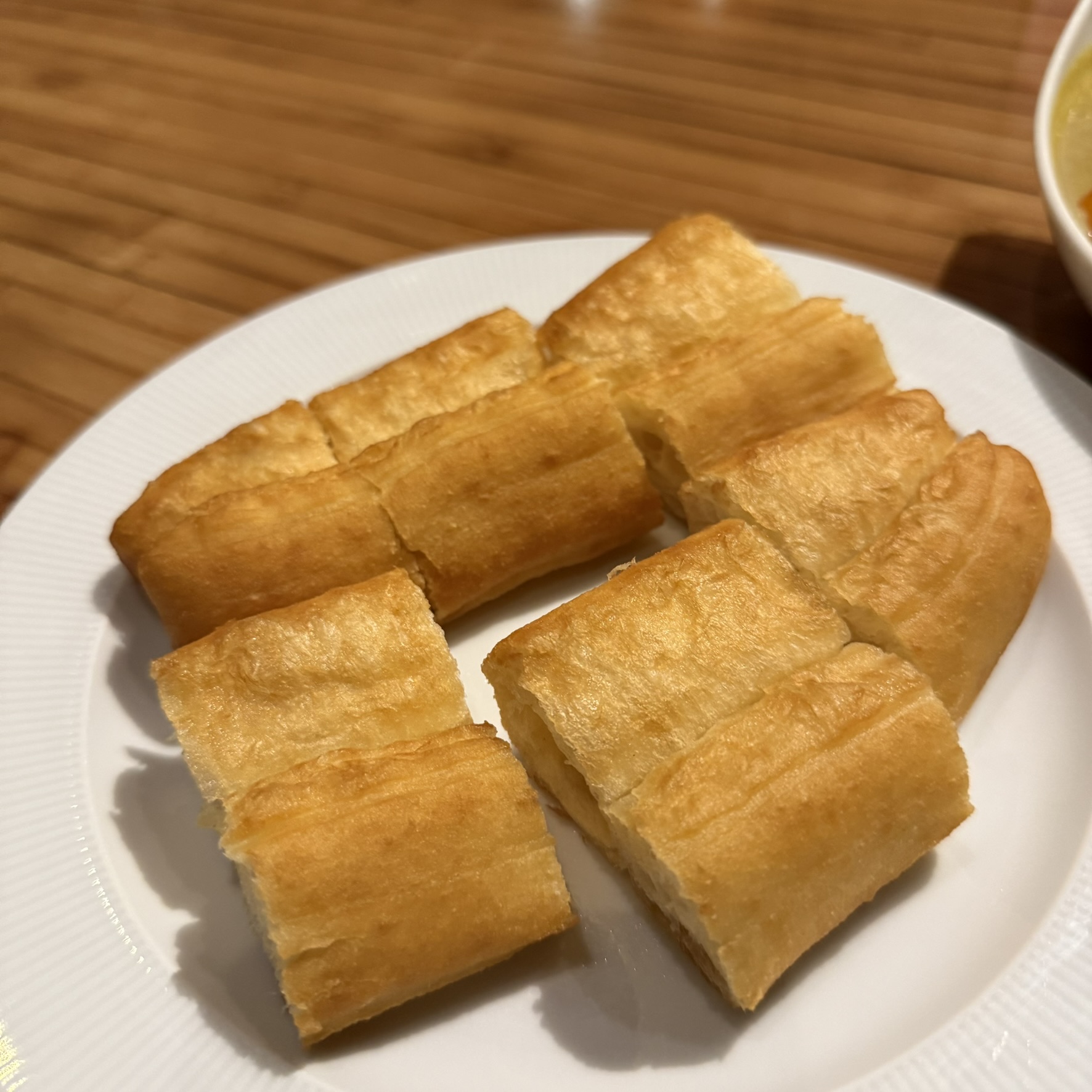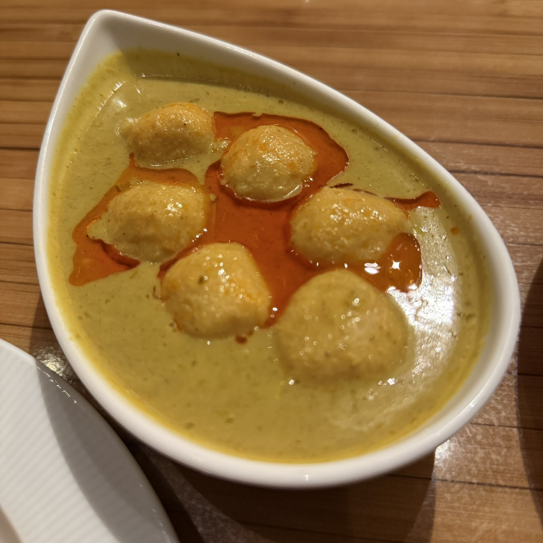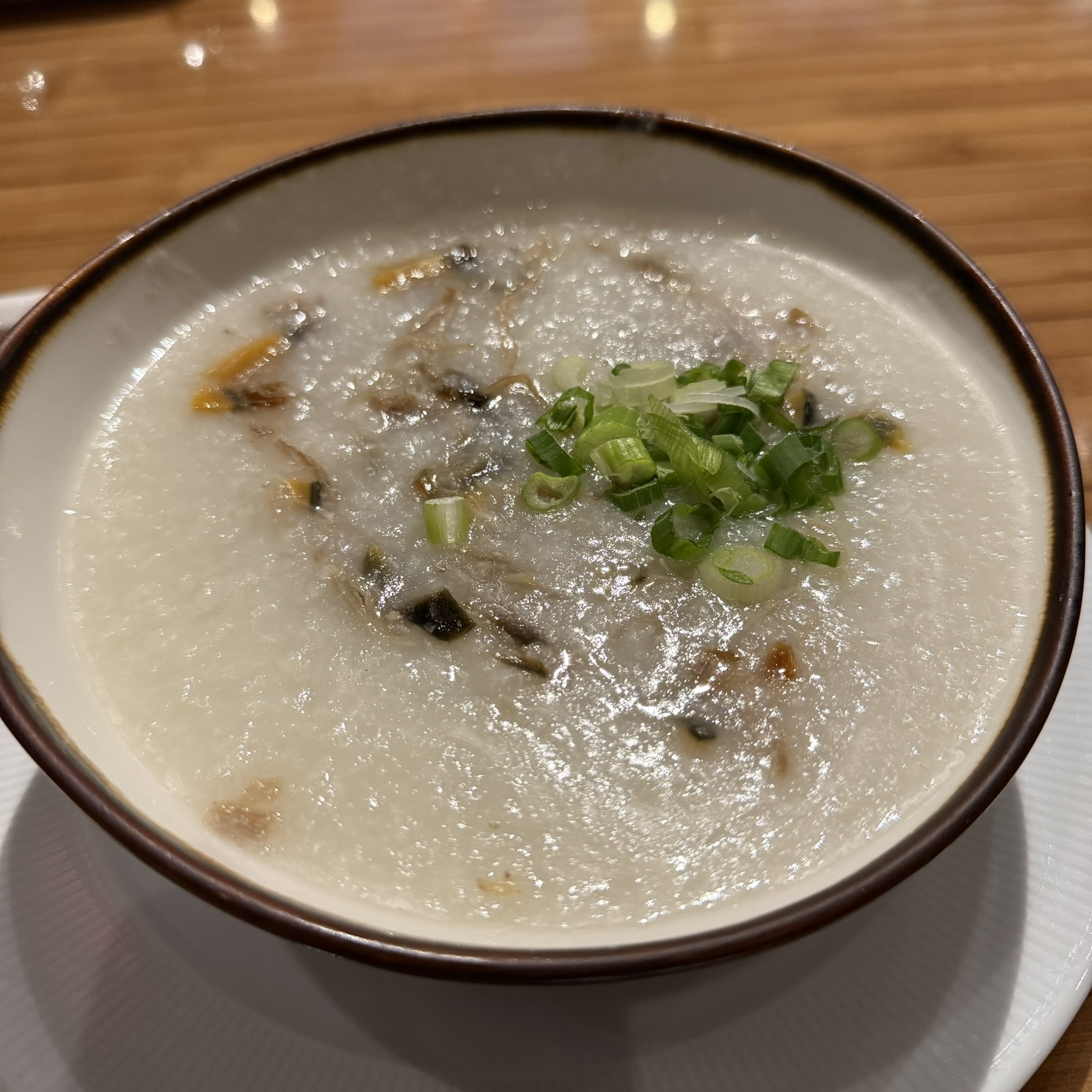 A little Pork and Century Egg Congee with You Tiao and some Curry Fishballs.